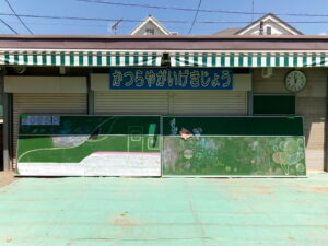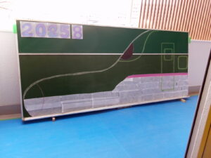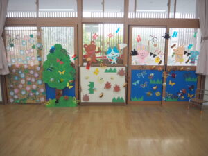 2025年の夏休みは2年目の園舎改修工事をしました。今回は保育室入り口に木の色のシートとお部屋のクラスカラーなどの色がつきました。その他1階の床やトイレ等の工事も行いました。夏休み中に工事後には使わないことになった黒板に2日間かけて絵を描きました。