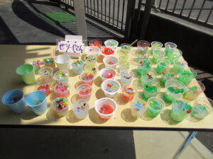 写真は子ども達が作った寒天ゼリーです。トッピングもしておいしそうなゼリーができました。(食用ではないので食べられません)
