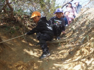 年少・年中・年長組はお別れ遠足で近所の公園にお散歩に行きました。公園に到着してから、山の斜面にロープをつけた探検コースで遊んだり、3学年で一緒に歩いてお散歩に頑張って行くことができました。寒い日が続いていたので幼稚園でお弁当を食べました。